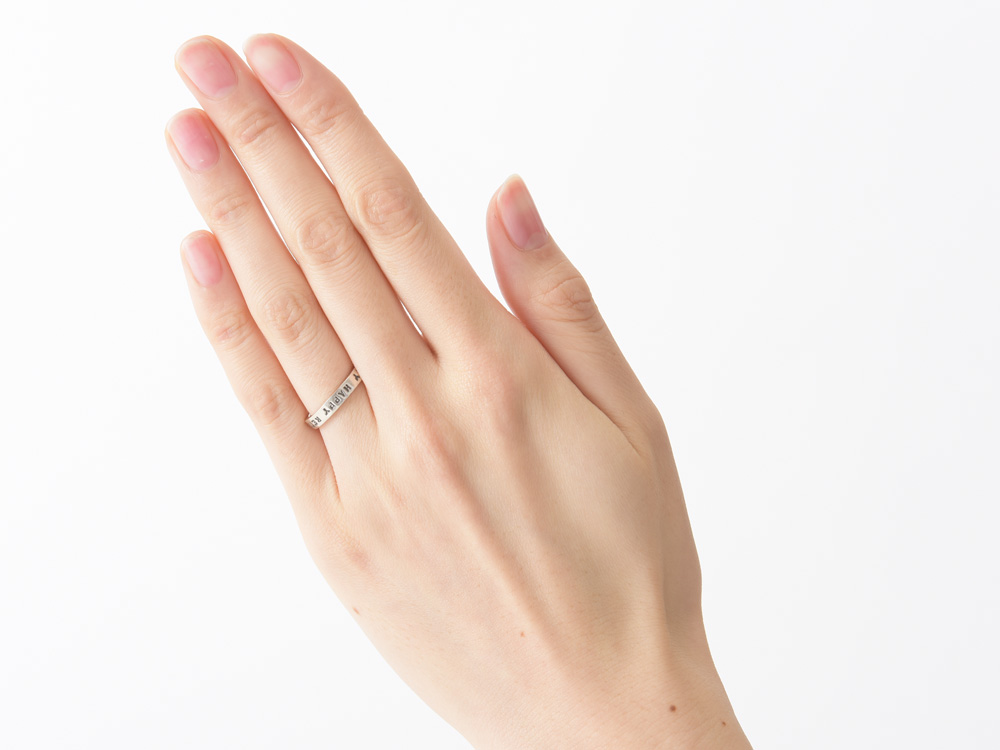 リング幅は、約3.0mm、シンプルな甲丸デザインのリングです。1.7mm程度の文字を1行で刻印します。シンプルなデザインなので、普段着けリングやペアリングにも最適です。