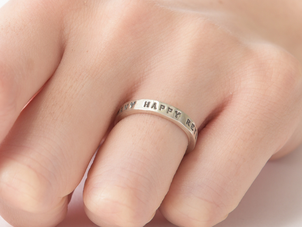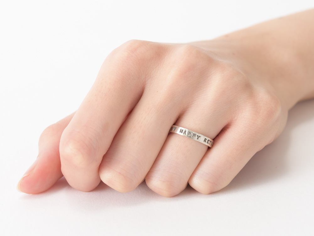 職人が1文字づつ打ち込むメッセージは、機械にはないハンドメイドのぬくもりが感じられます。指になじむシンプルであきのこないデザインと、輝きをおさえた質感が特徴です。